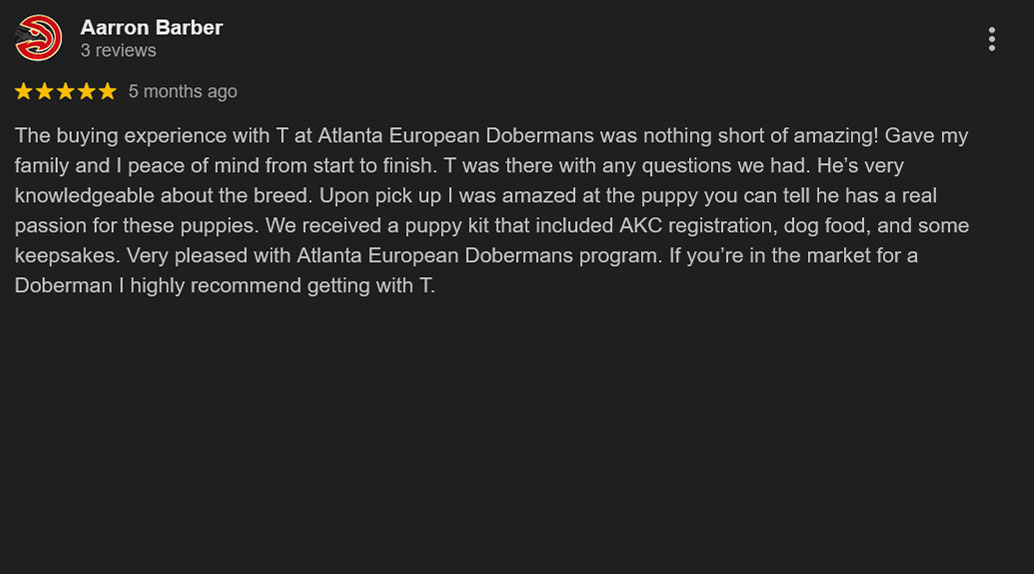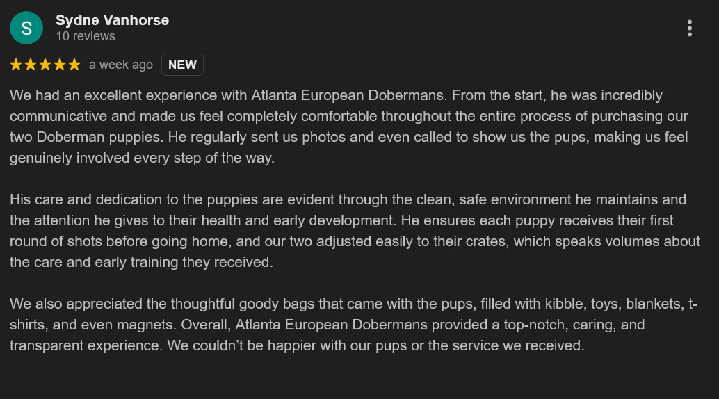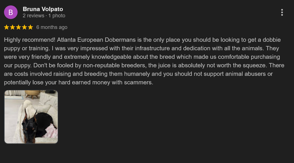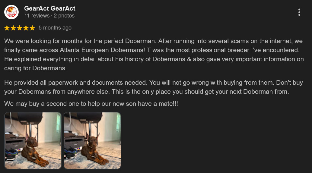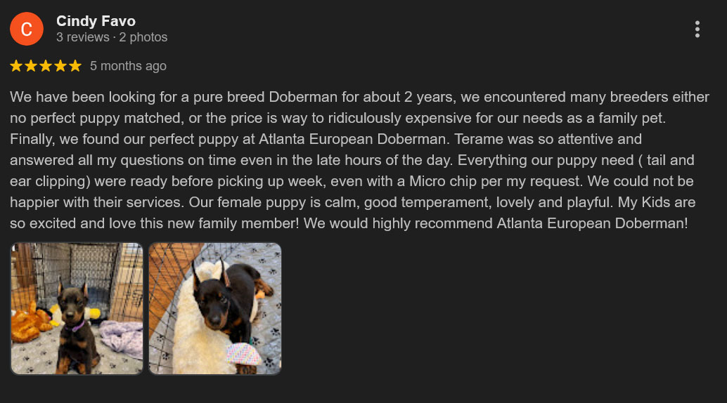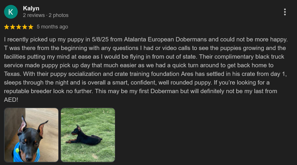 At Atlanta European Dobermans, we believe that what sets us apart isn’t just the bloodline — it’s our deep commitment to health, temperament, and lifelong support. Here’s why our Dobermans stand out: