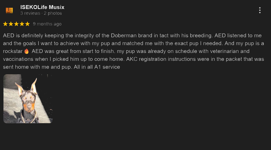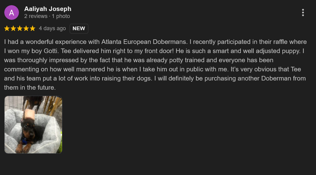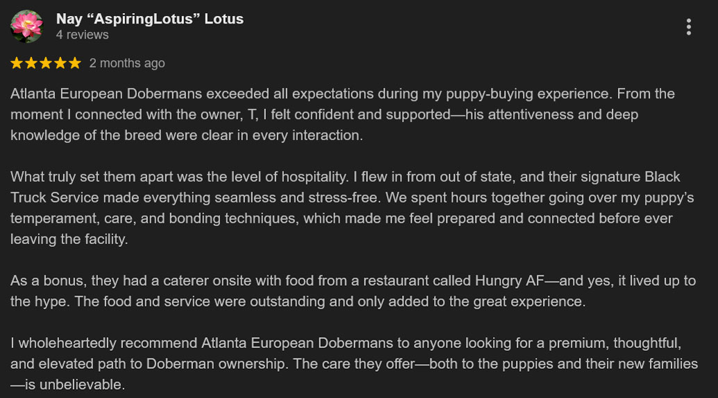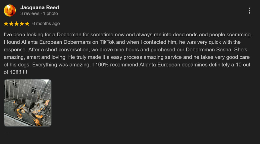 Founded by Terame (T) in 2013, Atlanta European Dobermans is built on over a decade of dedication, hands-on experience, and genuine love for this noble breed. Terame’s expertise ensures that every dog is more than just well-bred — they are balanced, purpose-driven, and ready to be a true companion.